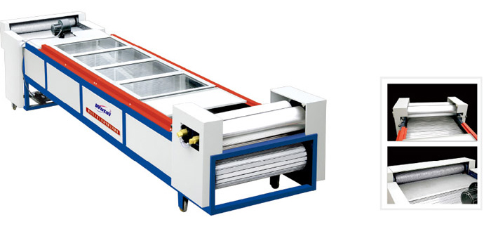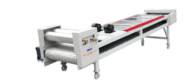 The cooler is consisted of cooling rolls , stainless steel segment conveyor , air blowers , crushers , frame and motors . The kneading material coming down from extruder are squeezed by the rolls into a long and wide sheet at thickness 1-1.5mm. The rolls are chilled by chilling water inside . The sheet is conveyed into the crusher while cooled by fans or chilled air blower continuously , in the end , the crusher breaks the sheet in to chips and chips fall down to the material container.